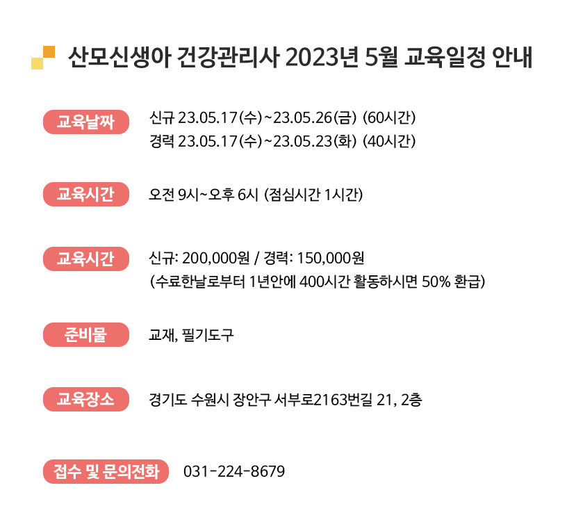 이번 2023년도 5월 수원사랑나눔 평생교육원 '산모신생아 건강관리사 양성 교육' 접수기간은 5월 16일 까지고, 5월 17일부터 진행된다. 교육 신청은 수원사랑나눔 평생교육원 전화문의를 통해 접수할 수 있다. (교육 신청 : 031-224-8679)